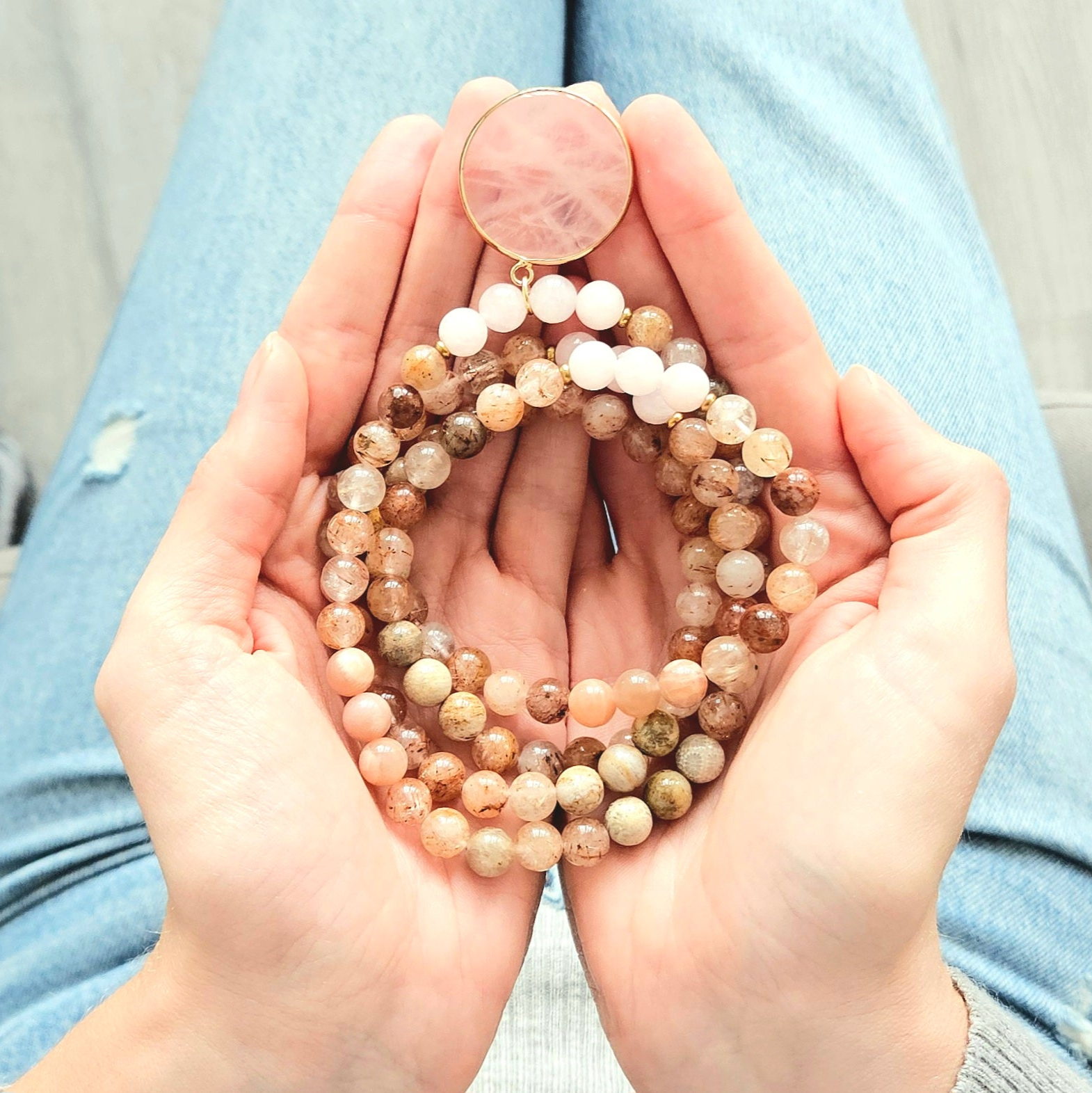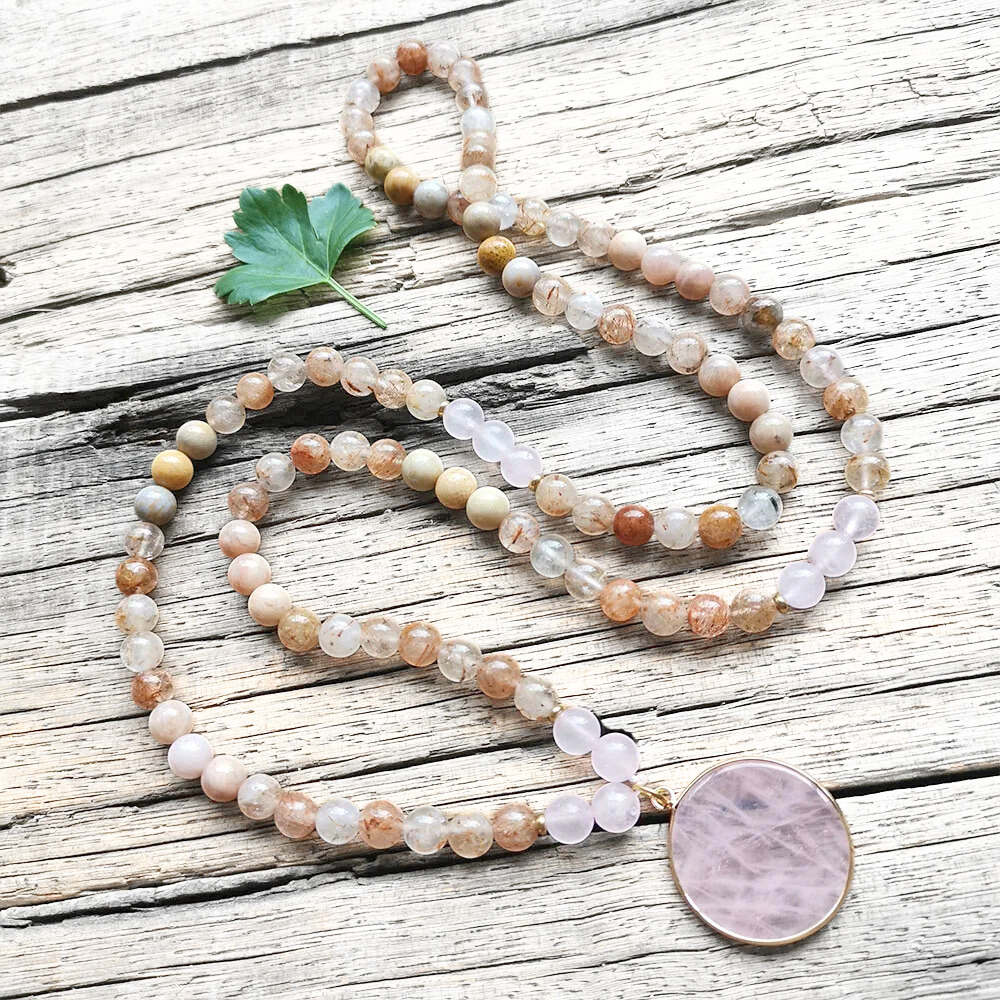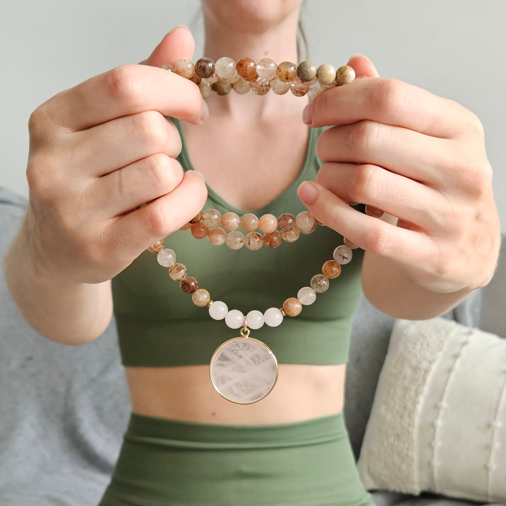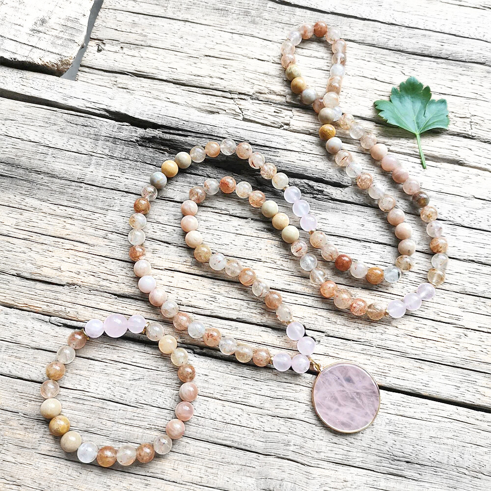 Experience love and vitality with our exquisite 108 Mala Bead Necklace, skillfully crafted from Sunstone, Coral Jade, Rutilated Quartz, and Rose Quartz beads, and featuring a beautiful Rose Quartz pendant. This gemstone mala necklace serves as a powerful tool for meditation and spiritual growth while symbolizing connection, energy, and self-love.