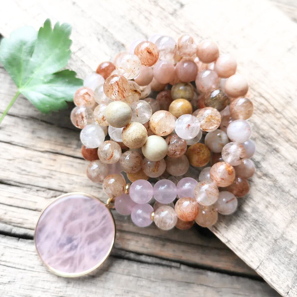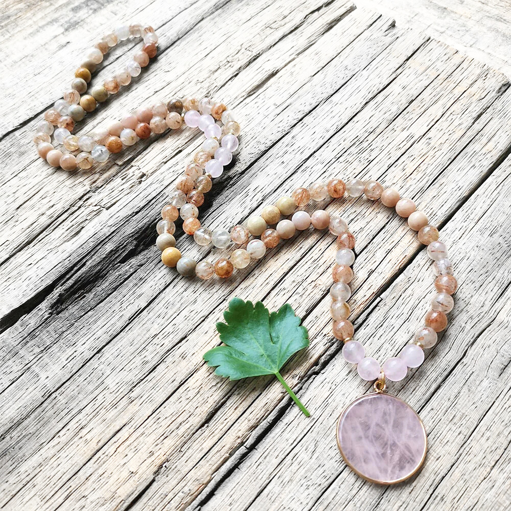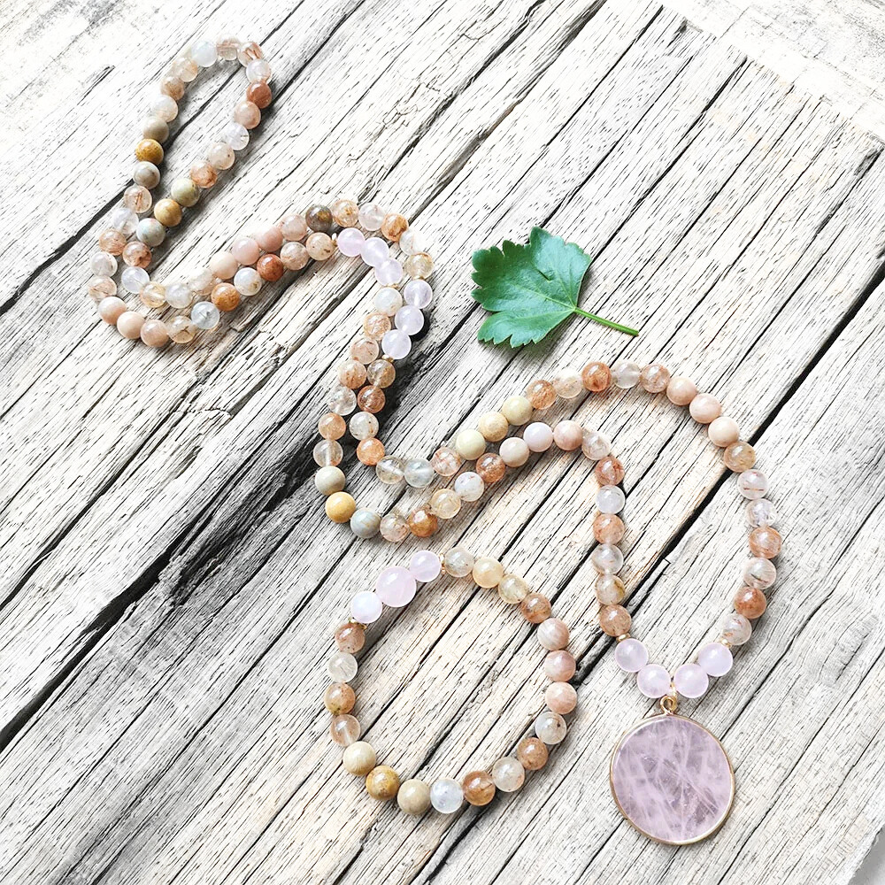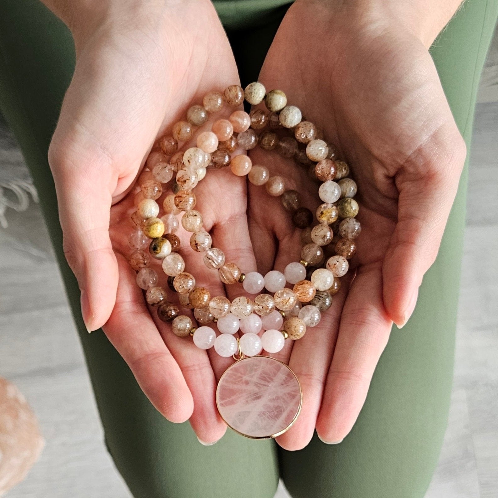 Experience love and vitality with our exquisite 108 Mala Bead Necklace, skillfully crafted from Sunstone, Coral Jade, Rutilated Quartz, and Rose Quartz beads, and featuring a beautiful Rose Quartz pendant. This gemstone mala necklace serves as a powerful tool for meditation and spiritual growth while symbolizing connection, energy, and self-love.