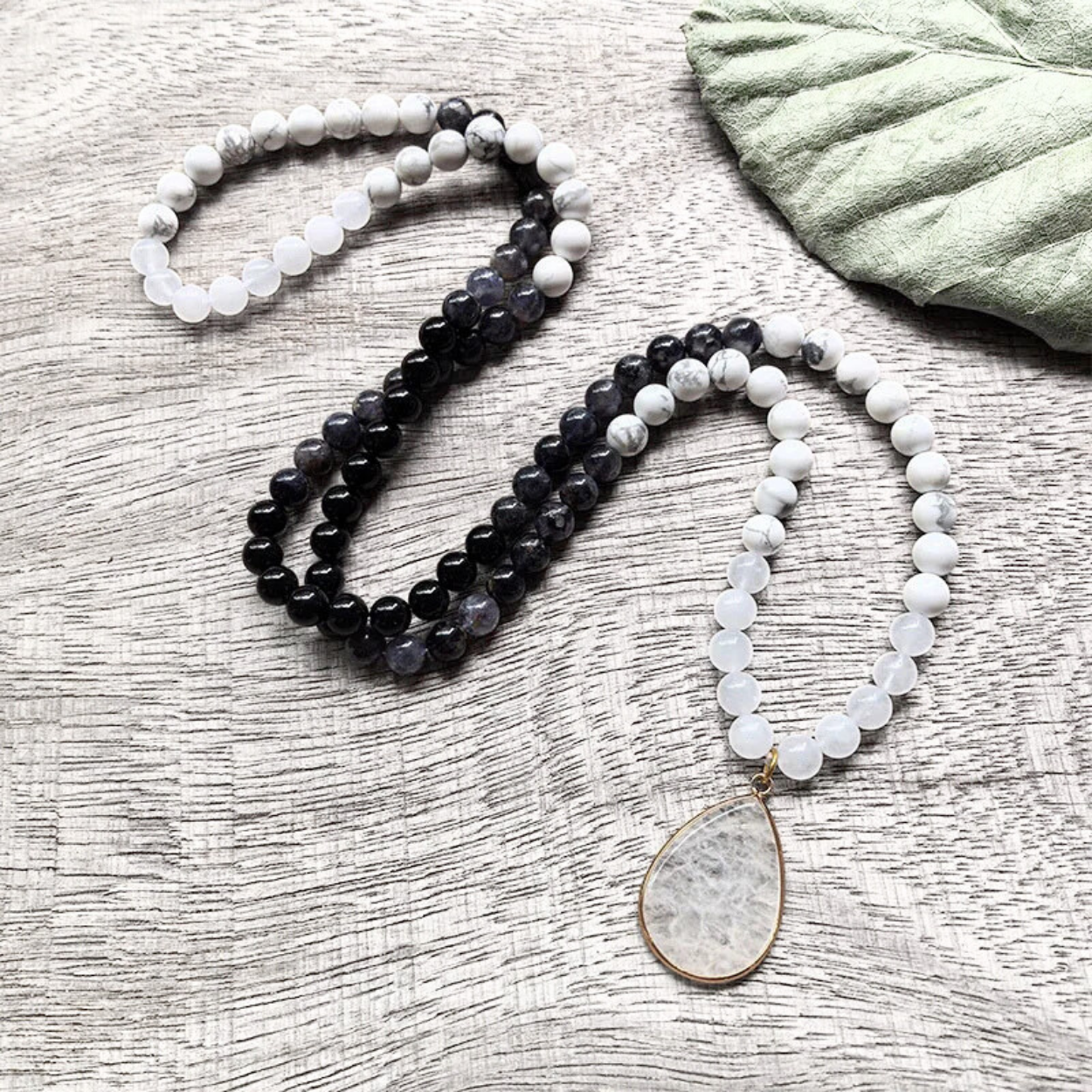 Perfect Gift: Our White Howlite, Lolite, Black Onyx & White Quartz mala bead necklace with a White Quartz pendant makes a meaningful gift for anyone seeking clarity, calm, and a deeper connection to self.