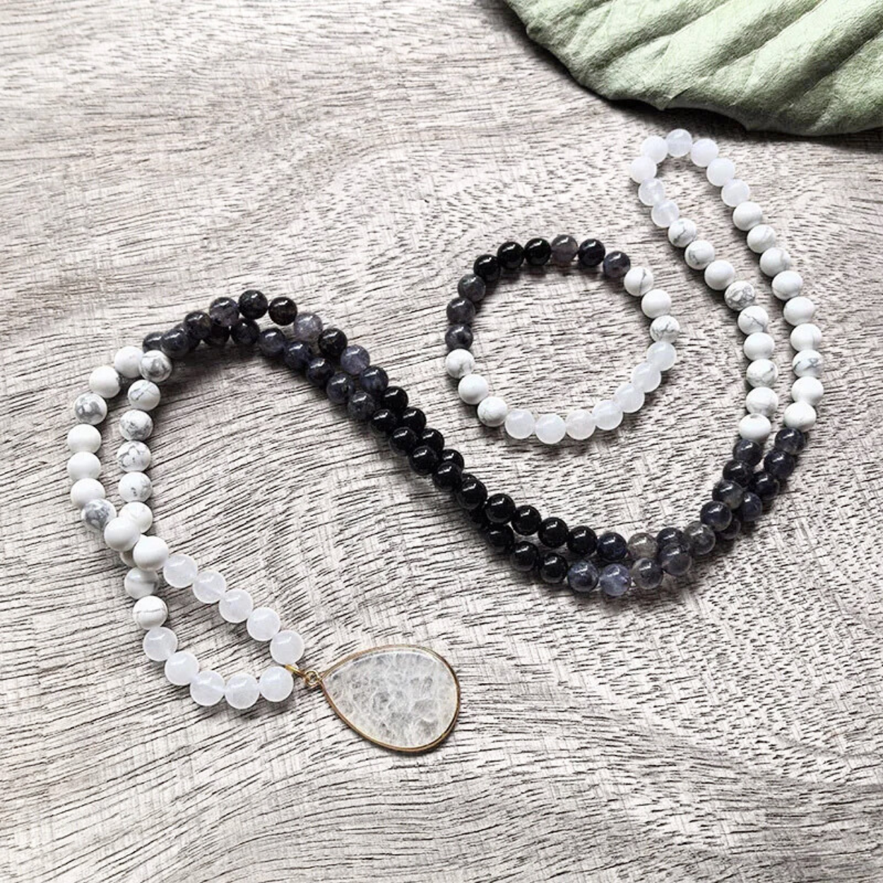 White Howlite, Lolite, Black Onyx & White Quartz Mala Bead Necklace - Mental Clarity & Emotional Stability
